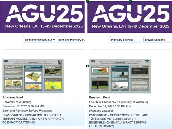 Chiemgau-Impakt AGU 2025 New Orleans – unsere Beiträge in der iPoster-Galerie von Ernstson|Veröffentlicht 10. Dezember 2025 Die beiden kompletten Poster können jeweils unter den Titeln angeklickt werden. https://agu25.ipostersessions.com/default.aspx?s=C4-22-76-55-96-6F-7D-39-DA-CF-51-7D-15-30-C0-13&guestview=true https://agu25.ipostersessions.com/default.aspx?s=F3-37-16-68-92-86-83-6A-7A-4A-21-6A-80-A7-67-23&guestview=true
